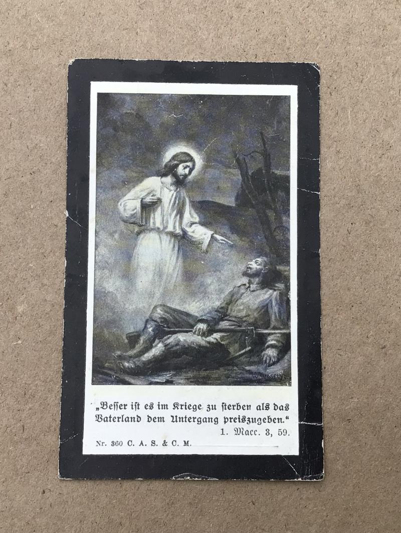 German World War I death cards, known as Sterbebilder, were memorial cards typically created by a soldier's family and distributed at funerals. These cards served as an obituary, prayer card, and keepsake to honor the fallen soldier.