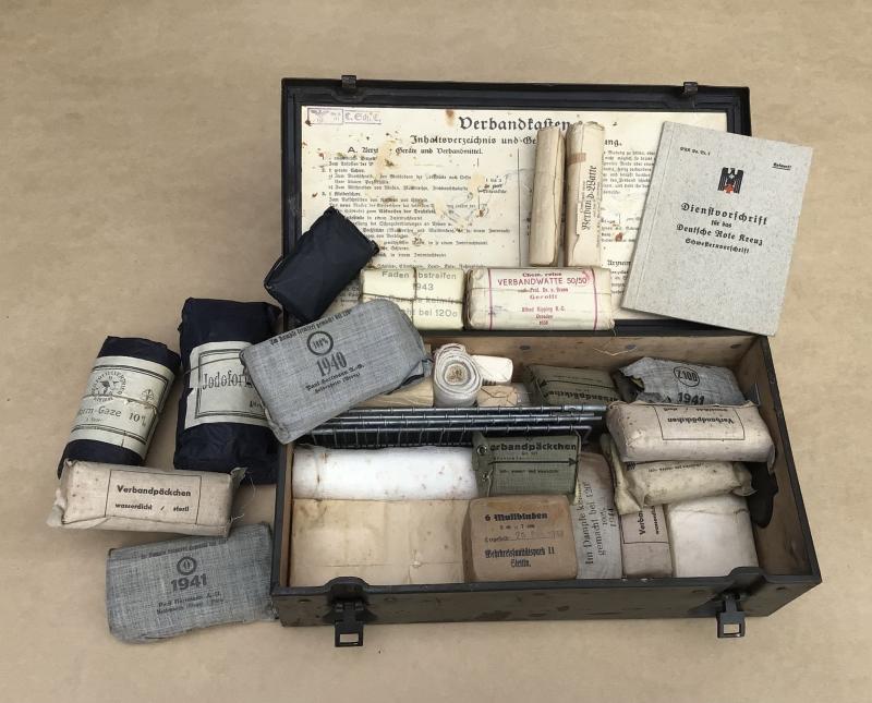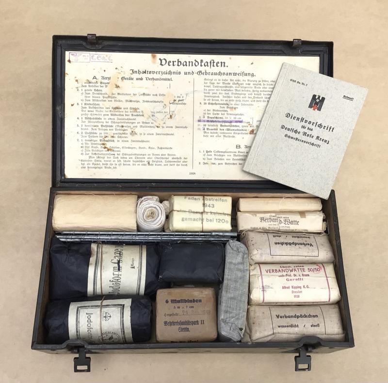 A lovely condition box with virtually all of the original paint finish remaining with the usual light scuffing and scratches coming with age. The Red Cross insignia is still perfectly visible. This example appears to be a Luftwaffe issue with “WL” hand painted designation number applied to the lid. The inside lid with its original paper packing contents label. Unfortunately the contexts now do not match exactly to the list. The box is absolutely full of bandages, field aid dressings, gauze, folding metal splints and a Red Cross instructional booklet all with a multitude of dates 1938-1943.