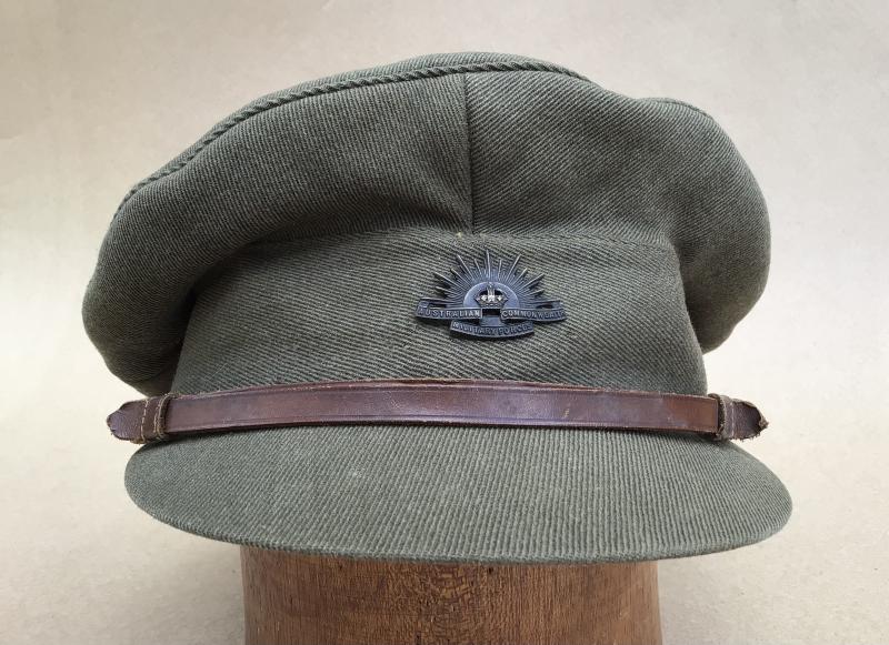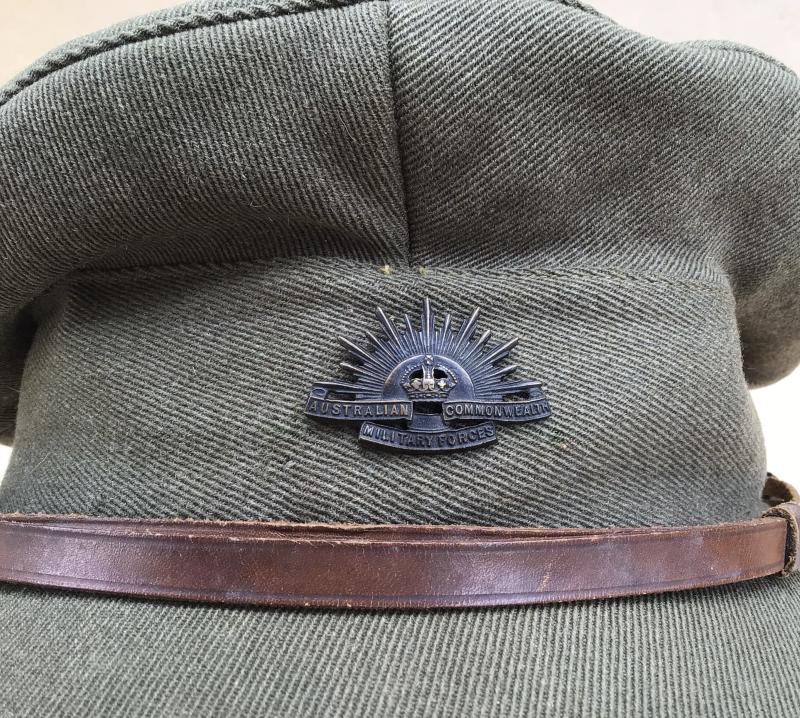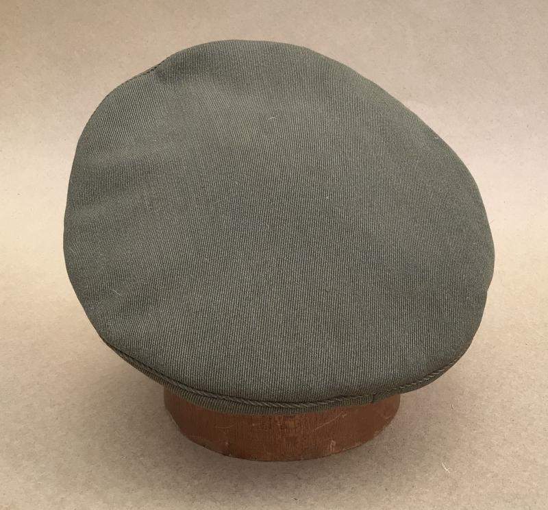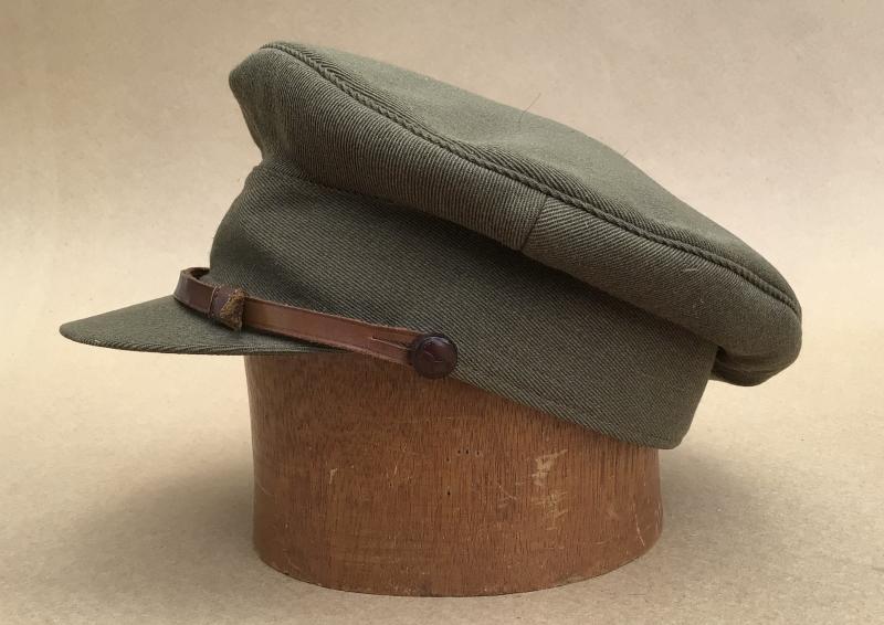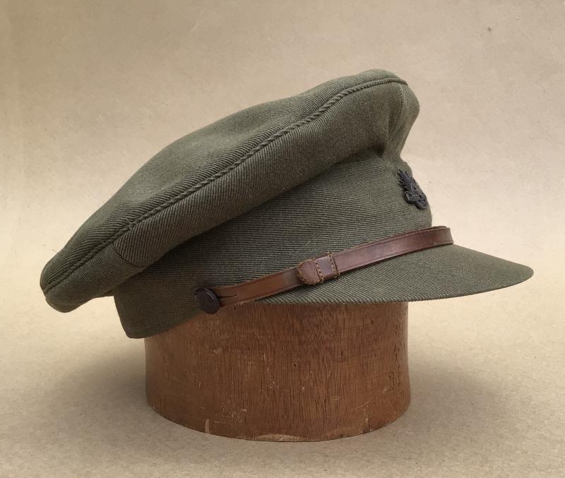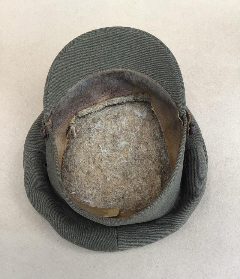 Khaki wool serge material with thin brown leather chinstrap secured by two leather “football” side buttons. To the front a nice officers quality rising sun badge, UK made by J R Gaunt. Whilst the exterior is in very good condition with no damage and an appealing shape the interior is not. The brown leather sweatband is intact. The inside upper lining is missing exposing all the inner hair padding. If you can live with that then this is great display item.