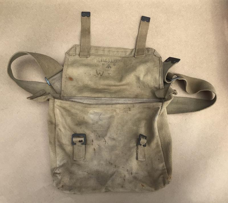 This is only the first one of these rare packs I have ever had for offer. Khaki web canvas with a broad arrow and dated 1917 on the inside flap. Attached is a single pattern 1908 web shoulder strap as a sling, this also dated 1917. Overall soiling but in good condition and extremely rare.