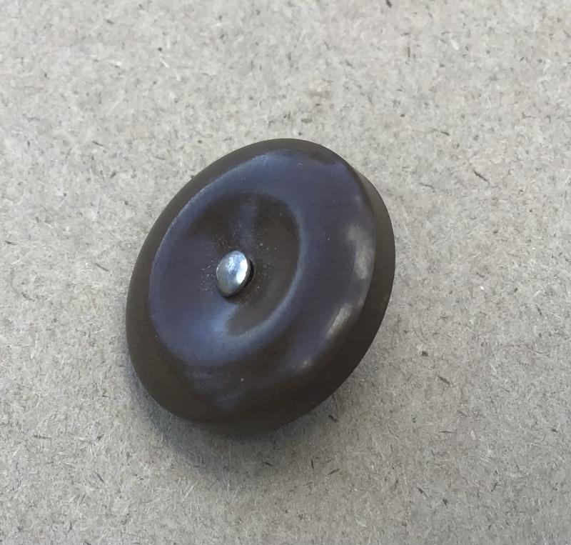 Army Brown bakelite button with integral magnetised section. Small dots on the reverse of the button indicate North and South. When suspended by a thread the button could be used by an evading or escaping airman to head for neutral territory. Excellent condition.
