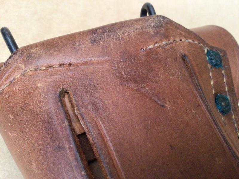 The holster is in great shape, with only light staining, and retains its original russet leather color, having never had oil applied which would darken the leather. The reverse is maker marked "Sears 1942".