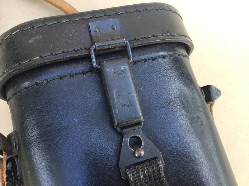 The binoculars are in good usable and adjustable condition. They are painted in the mid- late war ordnance tan underneath the paint 'Dienstglas' makred. 10x50.The black leather case is in extremely good condition and is marked and dated fm42