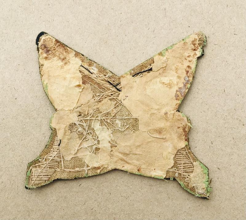 Silver bullion worsted on green wool backing for Rifle Regiments. 1891 date. Rare in this colour configuration.