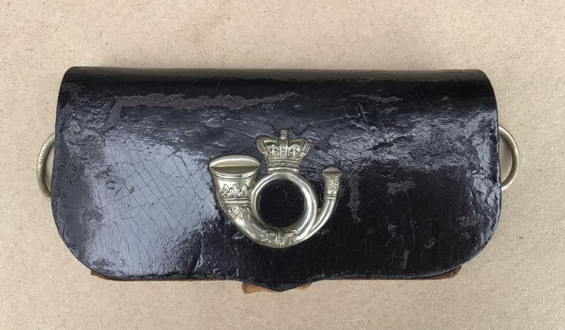 Patent black leather cartouch with white metal belt loops and a white metal QVC Rifles pouch badge ( screw post reverse). Lovely overall condition.
