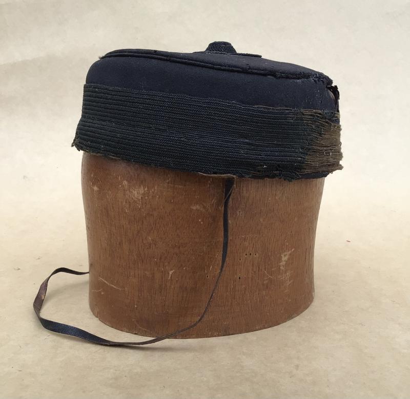 Fine melton cloth wool body over leather with a black mohair cap band and matching quarter foil to the top. A brown leather sweatband is still attached, red silk lining with gilt screen printed manufactures mark of Chas. Morris , Ballarat , this makers mark alone confirms its unit origin. The cap complete with a thin black leather chinstrap. The overall condition is fairly poor subsequent to obviously age and poor storage. There is a significant amount of moth damage to the reverse, not so visible from the from when on display, but clearly it probably amounts to at least a Quarter of the overall hat. The leather sweatband also about 80%, detached and all the way along the bottom edge of the cap the wall has been eaten away exposing the internal leather.