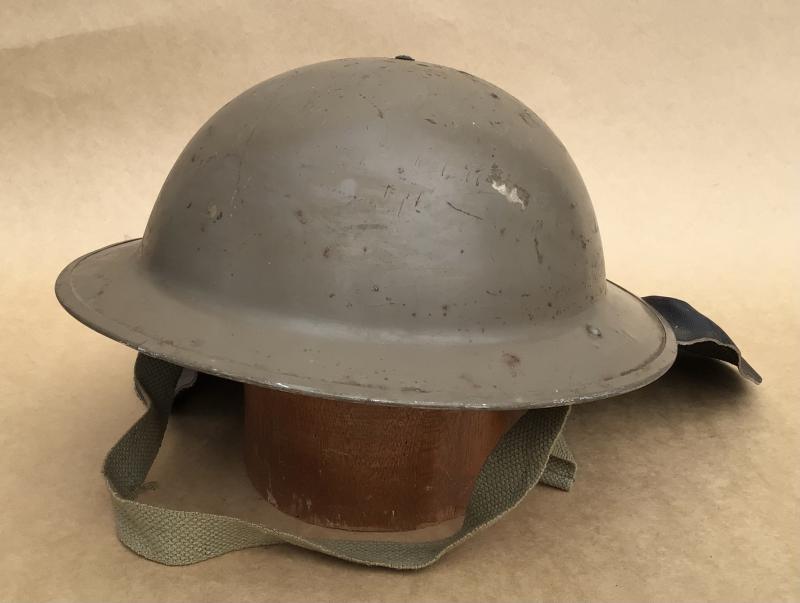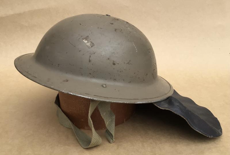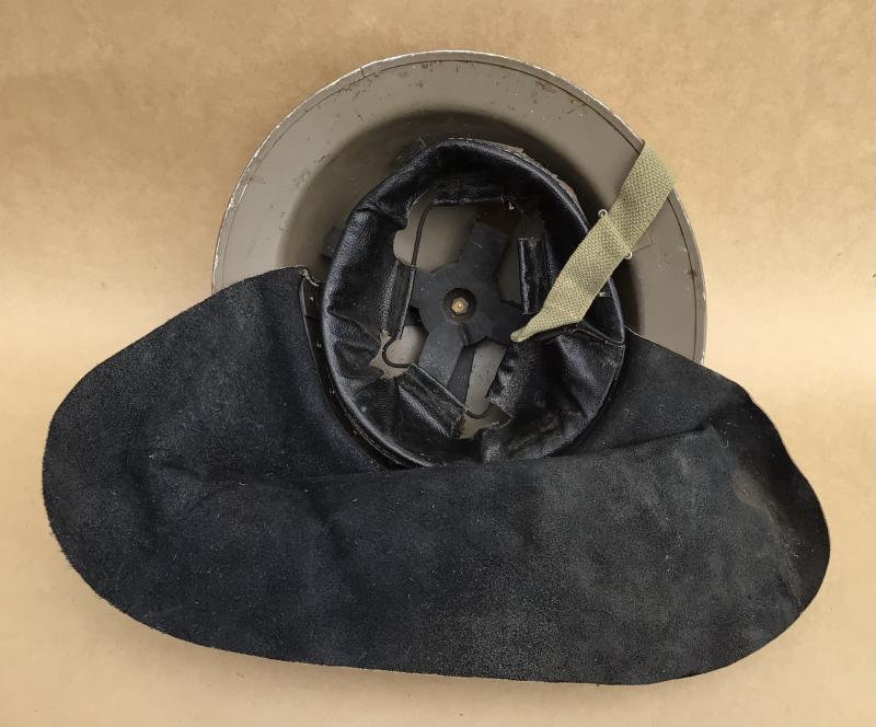 Light olive green painted finish. Has an original black leather neck flap in nice supple condition. Black oil cloth liner and chinstrap. Dated on the underside of the rim 1943. Issued and used. Y both civilian AFS and military fore fighting units.
