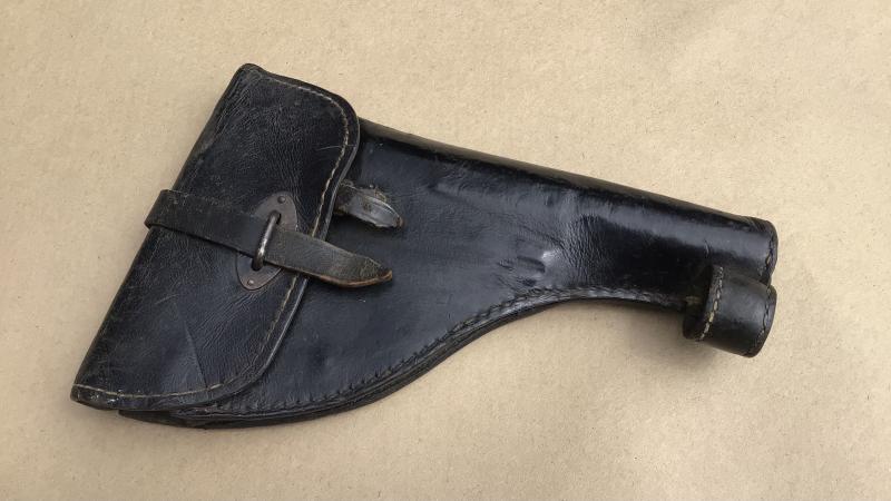 A choice example with lovely Cesar markings, date and waffenamt stamps. Working order. Comes with an original black leather holster. This with overall service ware. The flap separating from the securing rivets at three places on the rear. It still attached. No shoulder sling or cleaning rod. Both pistol and holster seldom seen together for sale.