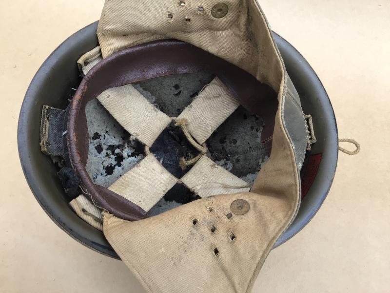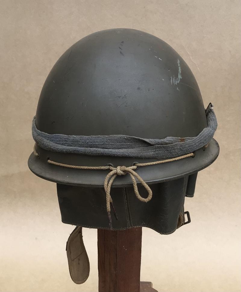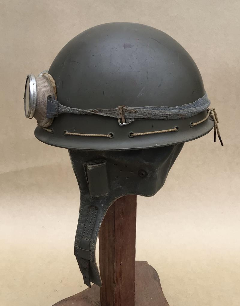 Has all of its original khaki green painted finish, the leather and khaki cotton neck flaps are complete and undamaged retaining the buckle and strap. A good original liner but as usual the felt inner lining well mothed. 1943 dated on the red inside decal label. Together with a pair of WW2 army dust and wind goggles.