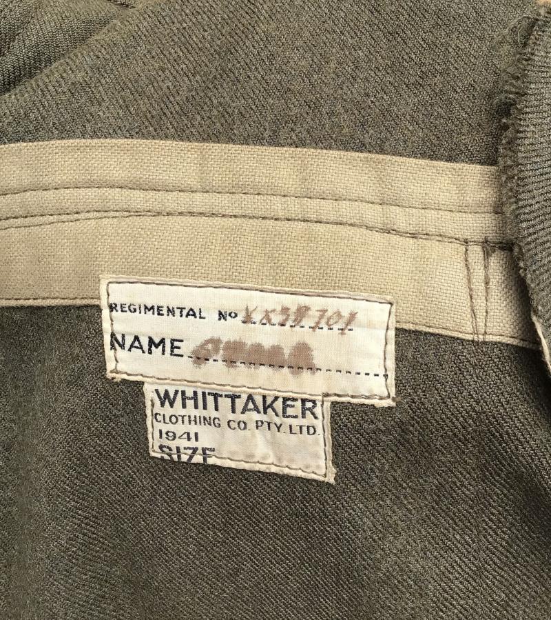 Khaki winter wool serge other ranks pattern four pocket tunic. Complete with all its oxidized AMF buttons, rising sun collar badges, shoulder titles and matching colour patches for 2/9th Cavalry Regemt ( Later 2/9th Cavalry Commando Regt). Dated 1941 and named on the inside label together with regimental number. This soldier being confirmed on the nominal roll as serving with the 9th Division Cavalry.