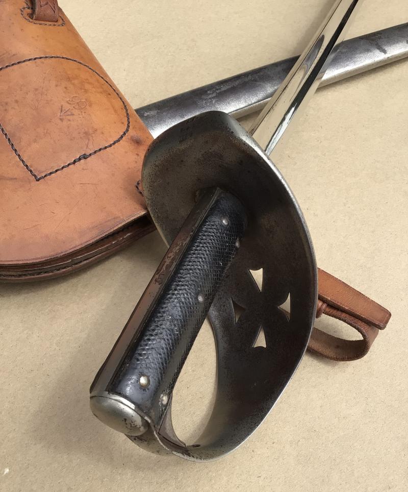 Pattern 1885 Cavalry Troopers Sword. The steel guard with a part rolled edge and a pierced Maltese Cross design.The checkered black leather two piece grips are in ver good condition. The slightly curved blade has a single fuller to each side that ends with the factory tip being rounded for practice. The ricasso is war department stamped WD and dated 1888 and 1889. The polished sheet steel scabbard has two strap rings on opposite sides securing a brown leather sword frog/horse shoe case. This later 1940 dated example but in wonderful supple condition.