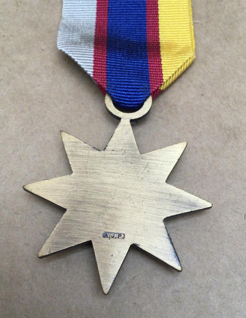 The Gallipoli Star is an eight pointed bronze star with a silver disc overlaid in the centre. This disc features, in relief, the king's crown in the centre encircled by the words 'GALLIPOLI 1914-15'. Suspension is by an integral ring from the top of the uppermost point of the star. The manufacturer's marking 'A.J.P' is impressed into the reverse. The ribbon comprises a central 9 mm blue stripe, flanked by 3 mm crimson stripes, the outer edges of 8 mm being gold on the right and silver grey on the left.