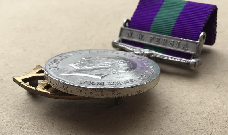 Claps “NW Persia”. Original full size medal correctly impressed “4736819 PTE E BRAY Y&L R”. Small edge knocks. Together with a single brass shoulder title.