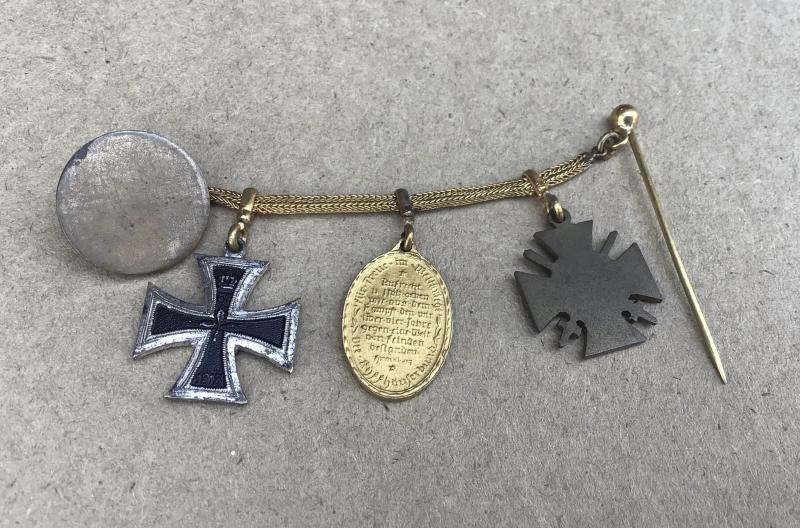 1914 Iron Cross 2MD Class, Kyfhauserbund Medal, 1914-18 Hindenburg Honour Cross with Swords. On a gilt metal chain with stick pin and button hole fittings.