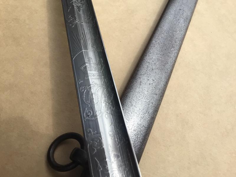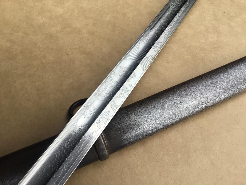 A good example of the gothic hilted patterns. Brass guard with “VR” cypher. Wire bound ray skin grip in good condition. Very clean bright straight blade by Henry Wilkinson. Acid etched with VR cypher. Officially numbered on the blade back “29200” indicating it was one of only 884 made in the year 1888. Comes with its all steel scabbard that fits very well to the blade.