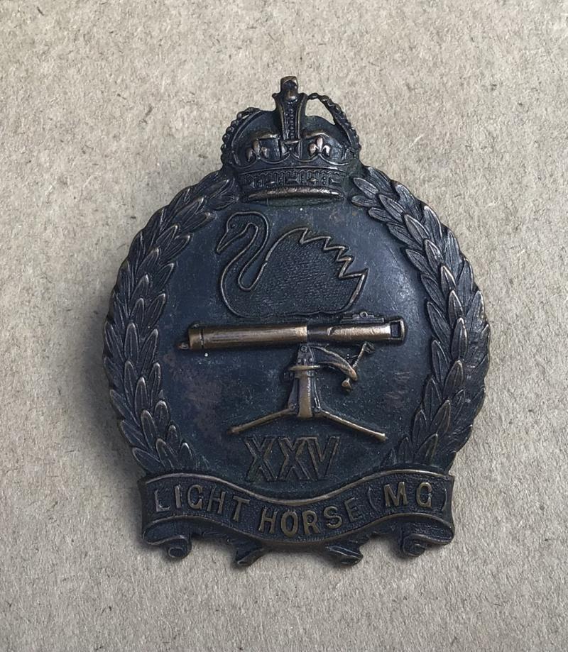 Light Horse Machine Gun Regiment. Hat Badge. Oxidized. 50mm. 2x lug reverse. Poor strike to crown. Maker marked to the reverse. K.G.Luke Melbourne.