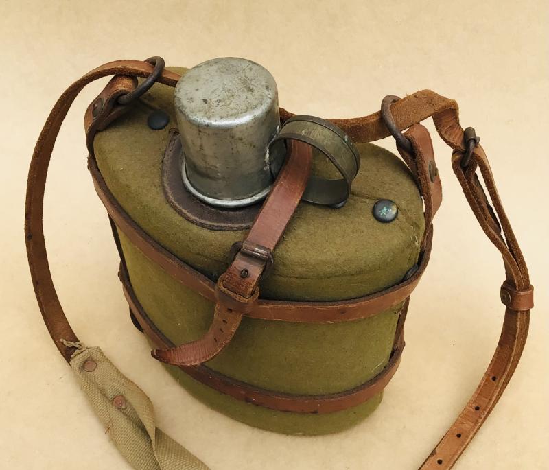 Tin water bottle with small tin drinking cup. Khaki wool felt cover and brown leather harness. Excellent condition overall. No markings or dates.