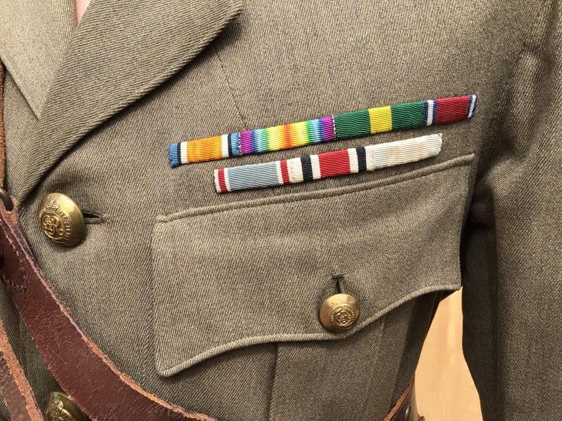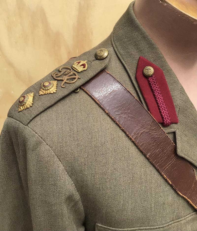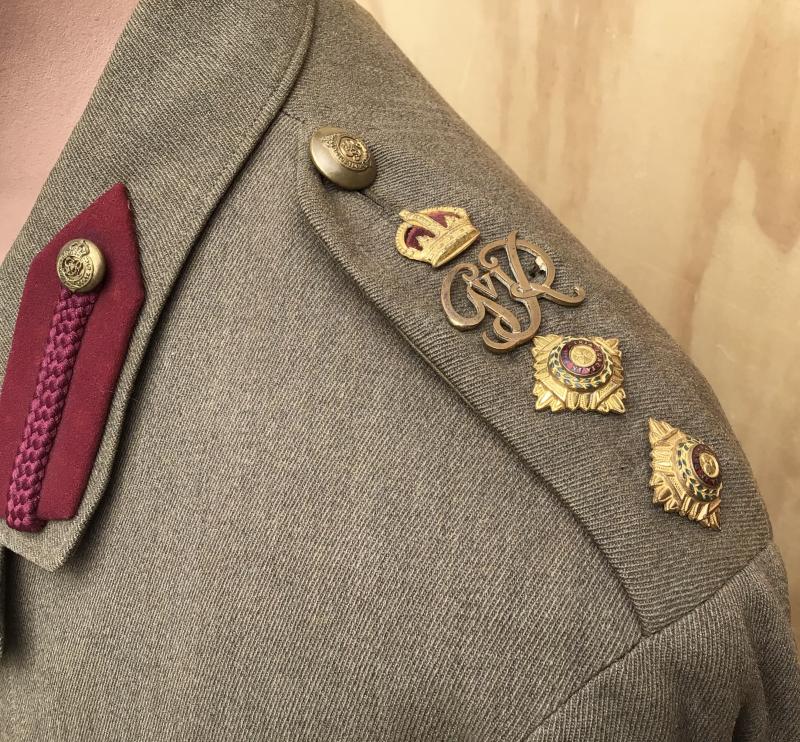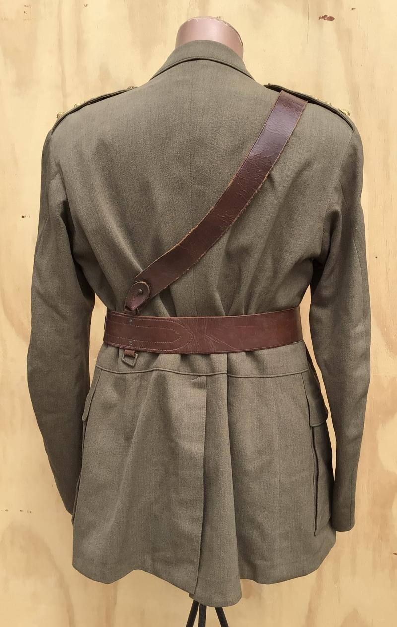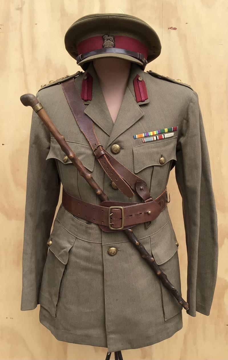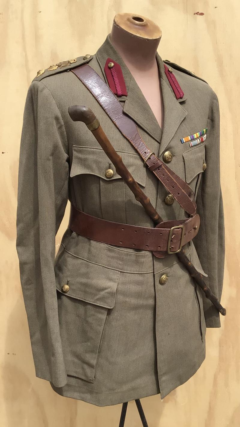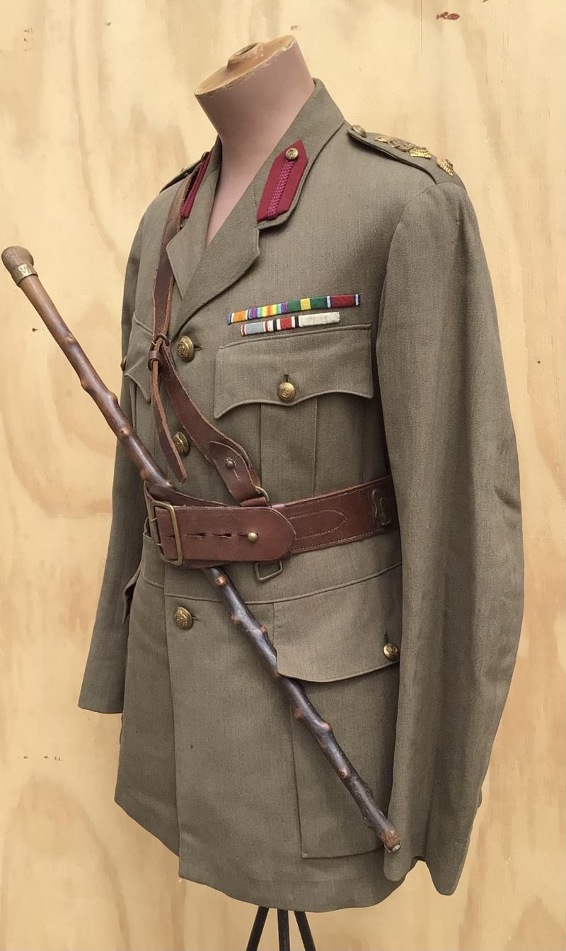 Super fine khaki wool four pocket service dress tunic. Brass GVIR Staff Corps buttons, 7 place ribbon bar, maroon ( medical corps) staff officers collar georgettes, gilt brass rank for Colonel and with GVIR ADC to the King cyphers. Comes with a brown leather Sam Brown belt with single cross strap and a Private purchase swagger stick made from a cut down walking stick.