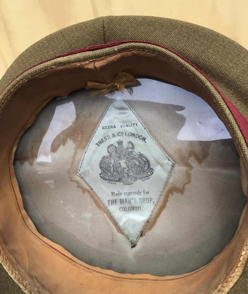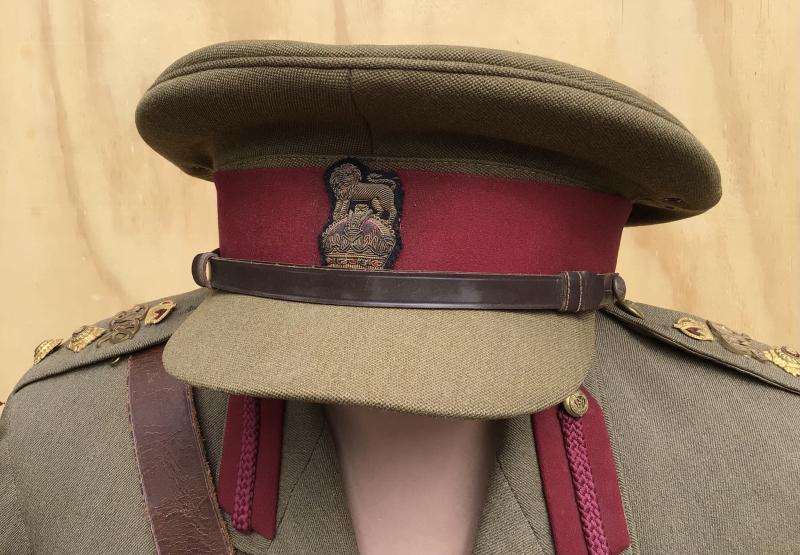 Lovely staff officers khaki wool visor cap with maroon ( medical corps) hat badge with bullion kings crown staff officers hat badge, brown leather sweatband with brass GVIR staff Officer side buttons. Made in London for a Colombo retailer. The cap in lovely condition.