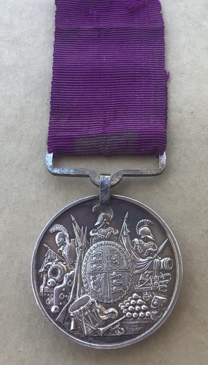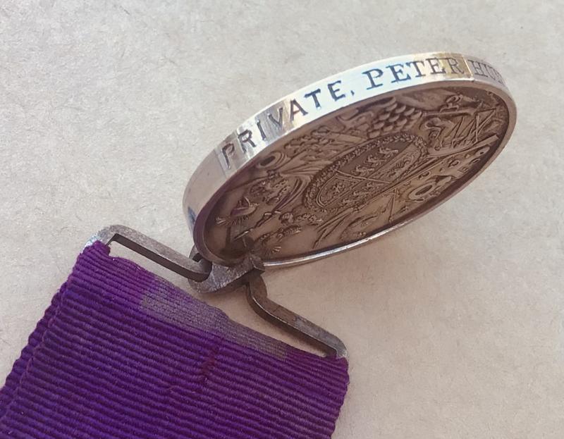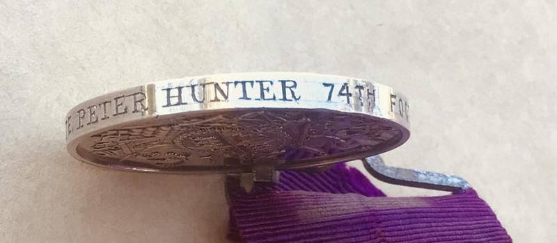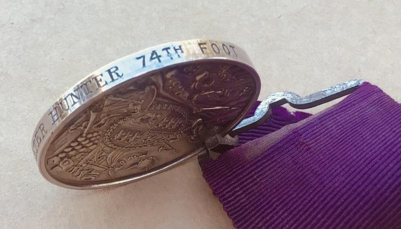 Type II Army Long Service and Good Conduct Medal. Iron clip suspension. Engraved in Roman capitals “ PRIVATE PETER HUNTER 74th FOOT”. Short pice of ribbon.