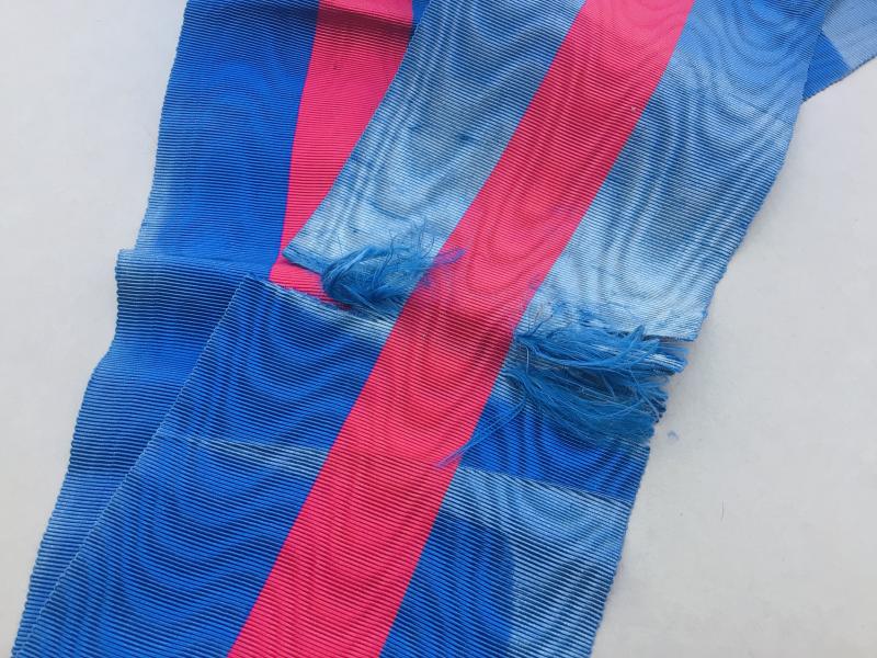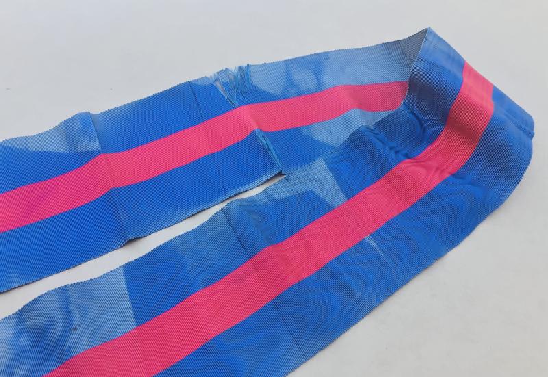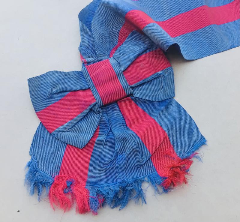 Knight or Dame Grand Cross Ribbon Sash. 100mm x 700mm. Now devoid of insignia badge. Complete with bow. Has heavy display wear with overall fading areas, some sections of fraying and the bow becoming detached. Hard to find original ribbon sash.