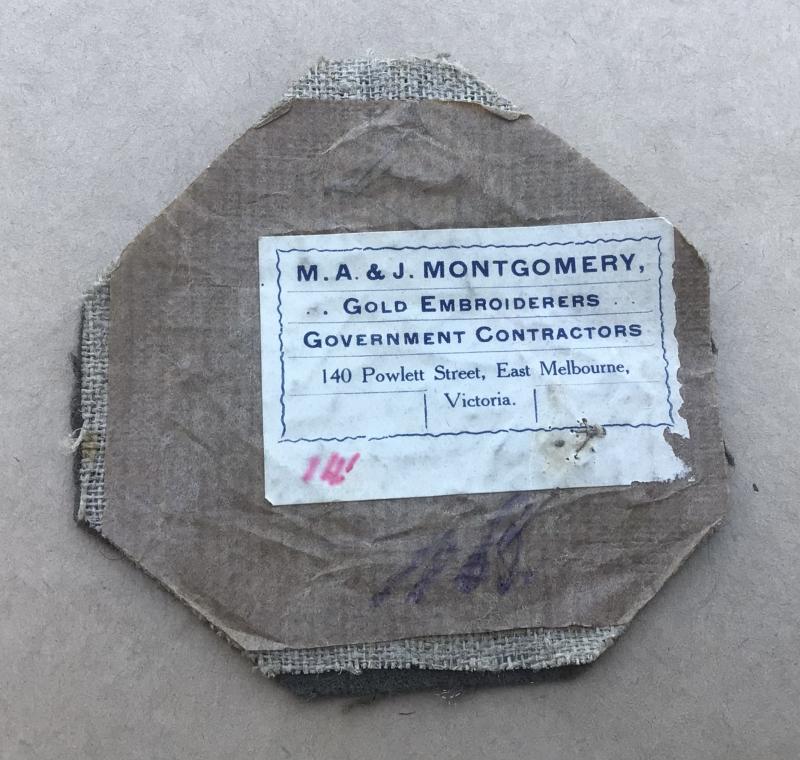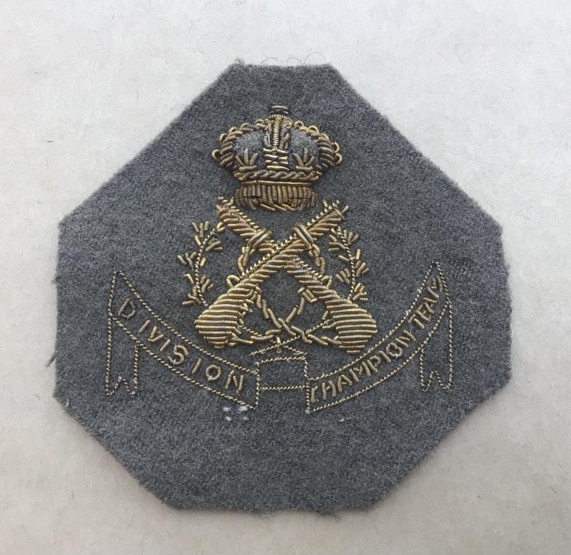 Gilt bullion worsted on khaki wool. The reverse with maker label still attached. Worn during the compulsory training scheme for shooting competitions.
