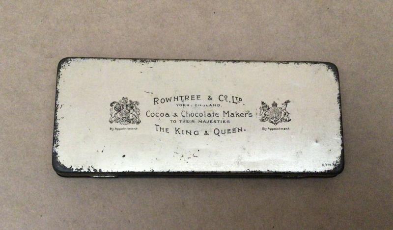 British George V 1935 Silver Jubilee Chocolate Tine by Rowntree and Co. No contents Patina consistent with age and use . Approx 7 x 3.5 x 1 inches