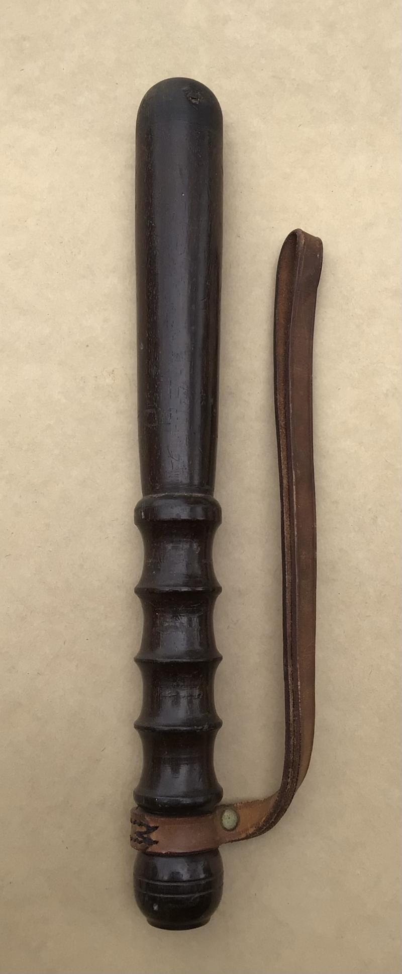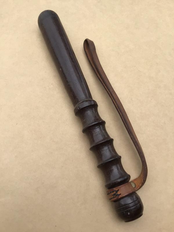Nice old turned cedar example with original brown leather wrist lanyard. No markings. 320mm.