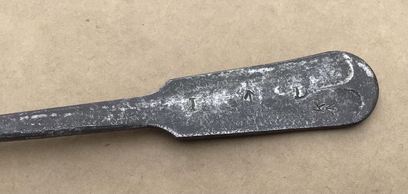 Zinc coated steel table fork. Maker marked “B& Co. Titan and dated 1916 (faint stamping). Stamped with army inspectors stamp and “D” arrow”D” ordnance acceptance mark.