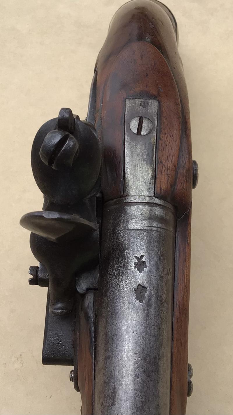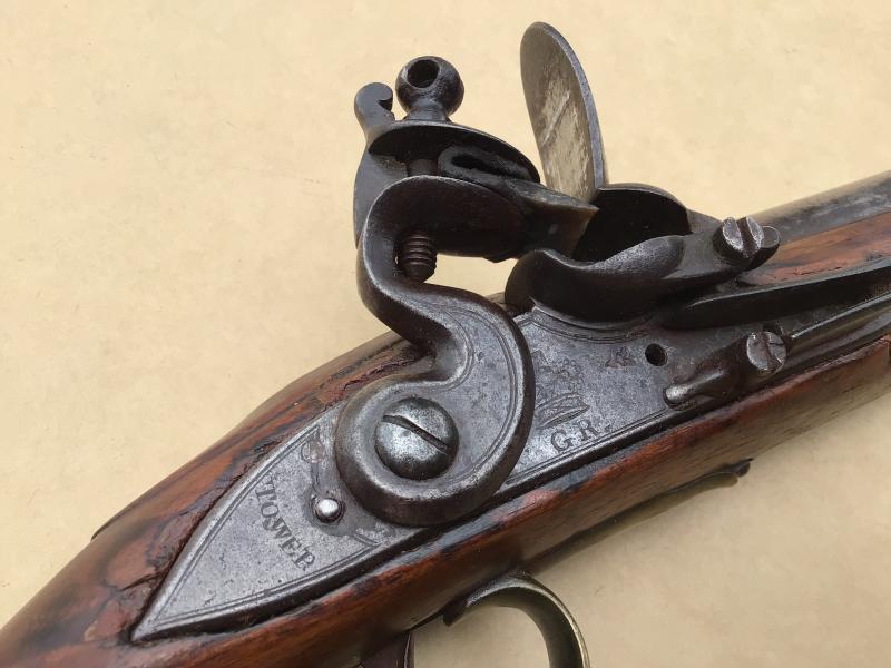 Georgian flintlock cavalry pistol. 15. 1/2 inch overall, barrel 9. inch with Birmingham proofs also stamped with a Georgian (GR) crown and “Tower” on the lock. Working action with flint. A walnut fullstock, with regulation brass mounts and original wooden and brass ramrod. Barrel and lock to a pleasing steel grey/ silver finish , the barrel with some age tone. Has usual light dings and knocks to the stock. The brass butt and cap, trigger guard, lock side-plate and ramrod pipes devoid of any heavy dings and in very good overall condition commensurate with age.