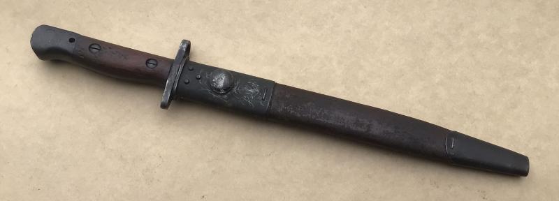 The Parkerized blade well marked from the Lithgow annex factory at Orange and dated 1945. Working locking stud and original wooden grips. One side of the grips with many small dents ( used as a hammer) and the other side stamped “Slaz44”. Matching 1945 dated “Mangrovite “ scabbard.