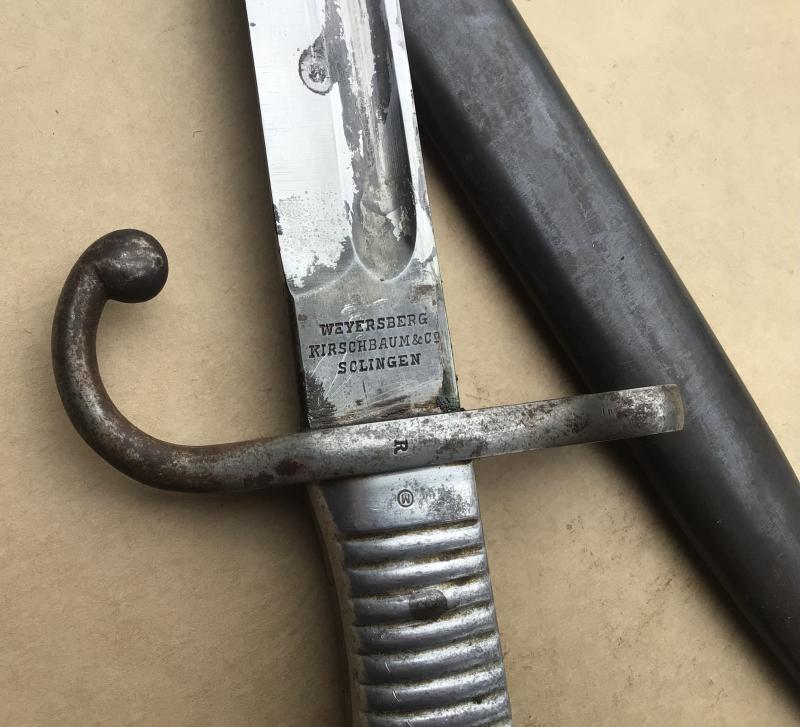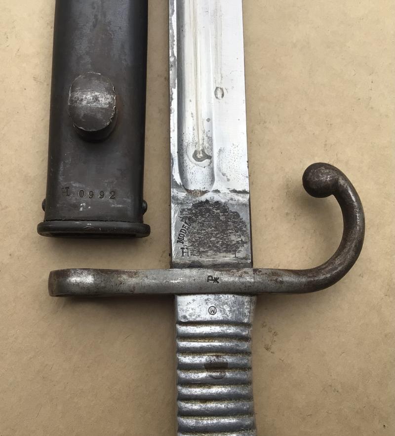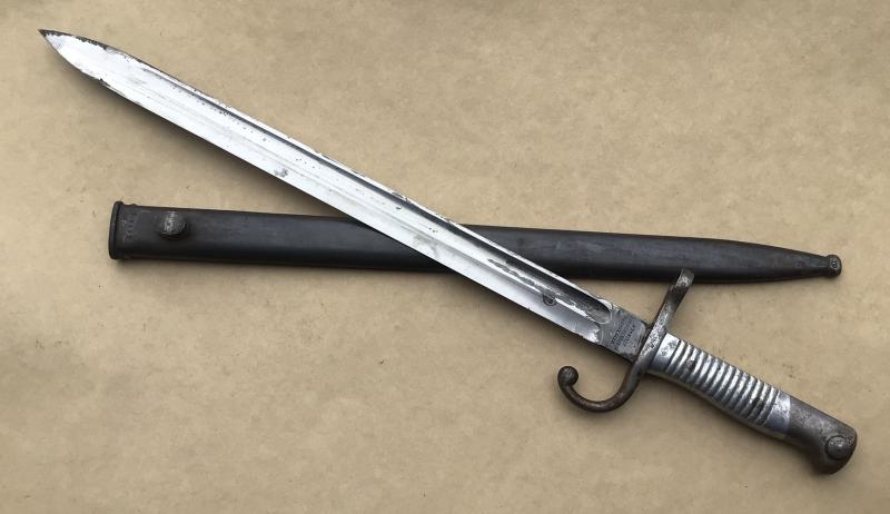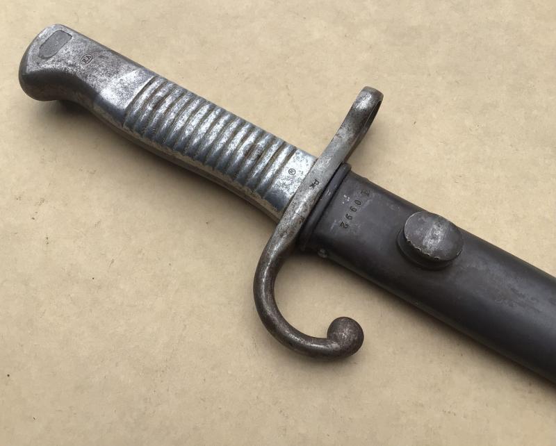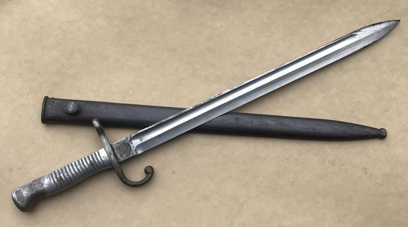 All aluminum grips. The national crest partially erased. German makers mark. Working locking stud. Comes with its all steel scabbard with non matching numbers. Fair example.