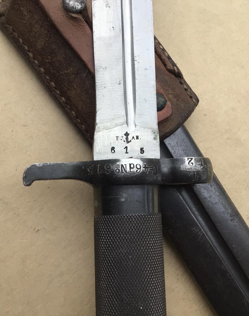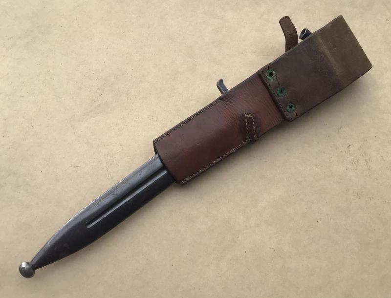 An excellent clean example. Working locking prudential. Comes with its all steel scabbard, brown leather fog and “peacetime” locking plate that locks the bayonet to the scabbard, this adaption now often seen.