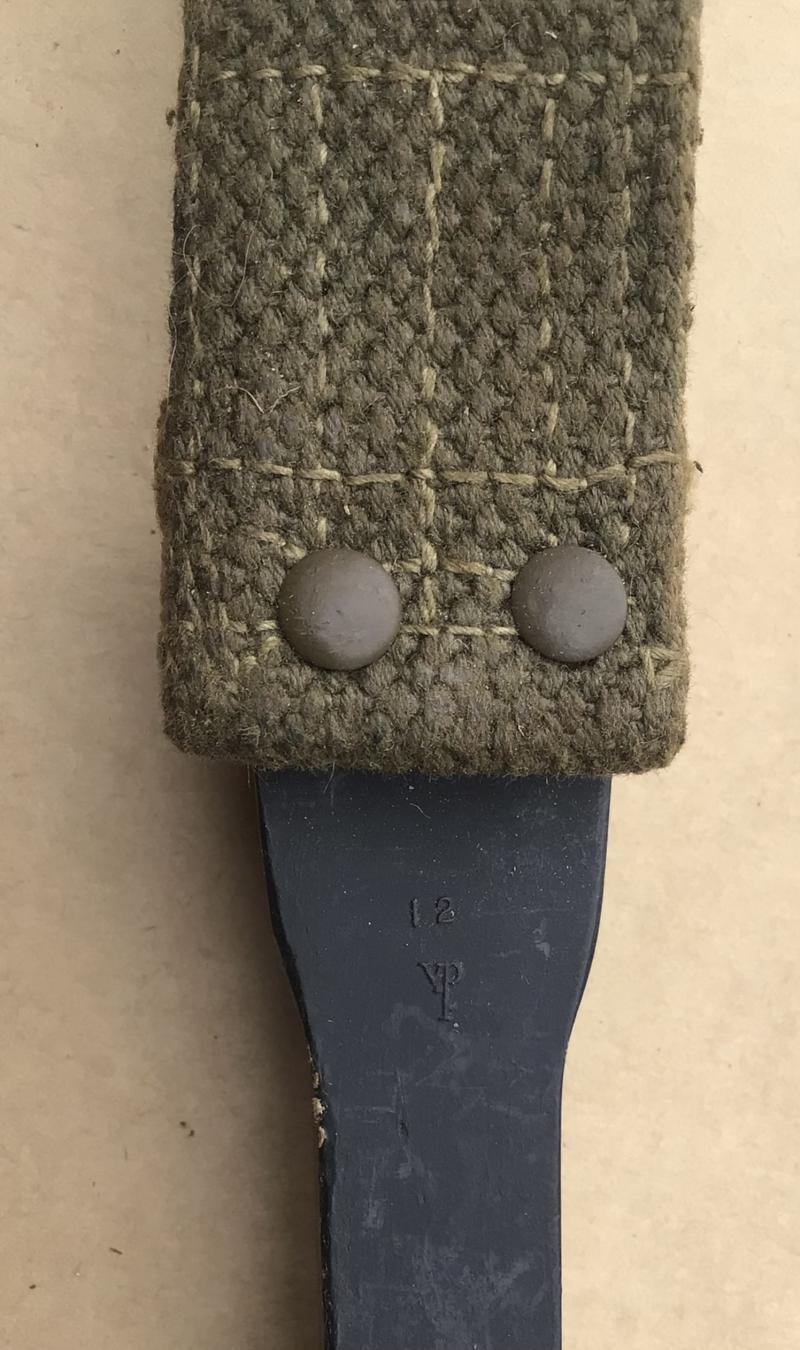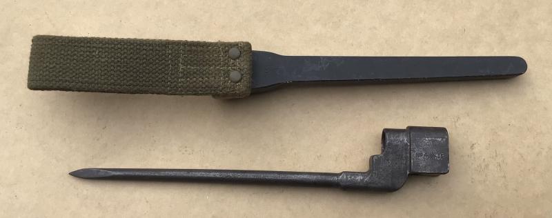 No.4 MkII Spike Bayomet. Working locking catch. The bayonet is complete with a scarce American M5 scabbard with integral webbing frog. The M5 scabbard was produced by the Beckwith Manufacturing Company, New Hampshire, known during World War II as Victory Plastics. The Bakelite scabbard is marked on the back with the Victory Plastics VP maker’s mark and is in very good condition.