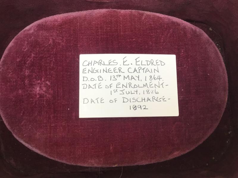 Black Japanned tin storage tine with a maroon velvet padded interior. Used to store a pair of dress Epaulettes. A Queen Victorian crown distributor label to the lid for Matthew’s and Co, Portsea. The brass name cartouche engraved to “C E Eldred”.