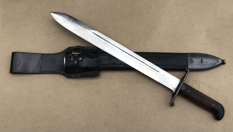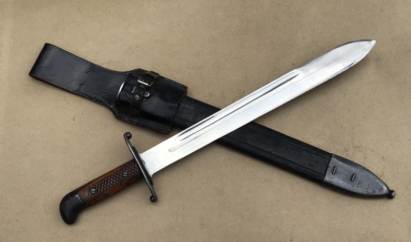 Total length 52 cm. Width at the ricasso: 4 cm. The scabbard fitted with its oringal black leather frog also in excellent condition. In my opinion, one of the worlds best looking sidearms.