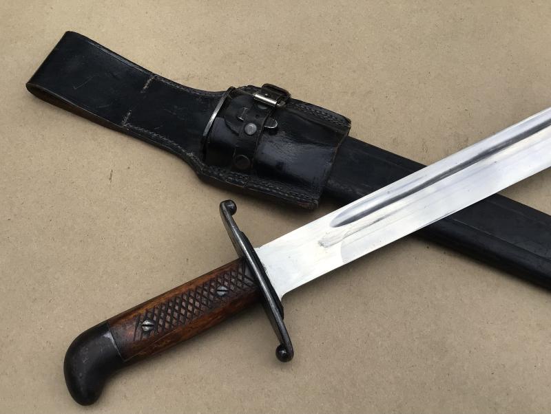 Excellent- heavy bright finished fullered blade with no markings. Large false edge. Blued hilt with a rounded pommel and a large crossguard. Excellent checkered wooden grips secured by two screw bolts. Excellent black leather scabbard with great tooling and all stitching intact. Stapled blued mounts without dents. Frog stud is maker marked: F I. (Fabrica de Itajuba)