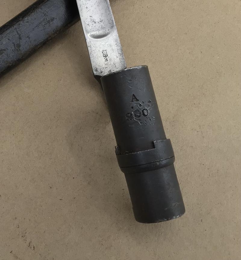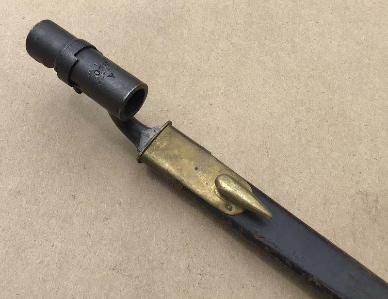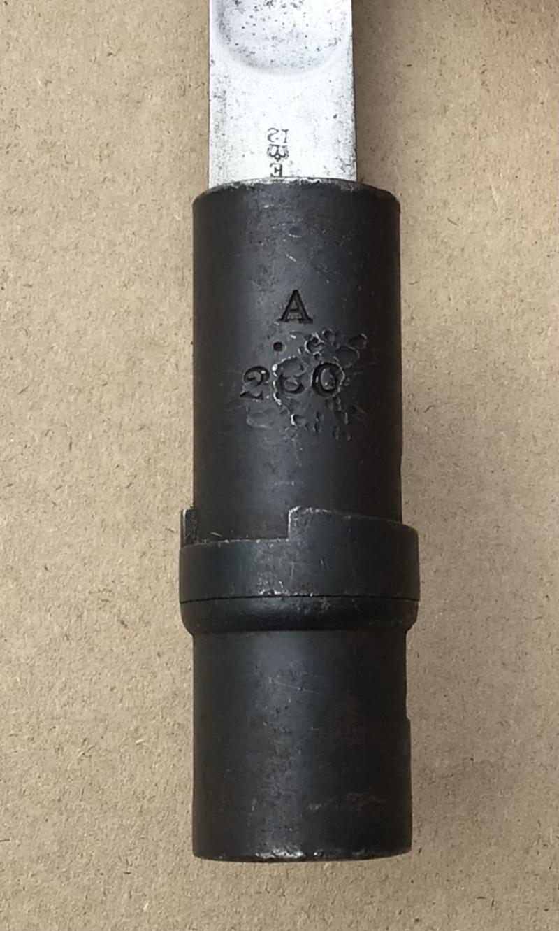 A rather rare NSW issue bayonet. Locally altered /converted from a Pattern 1853 bayonet. The .450 New South Wales issue Braendlin Cadet Martini socket bayonet was in use in the early 1890s. Locally altered Patten 53 bayoneit made to suit the Braendlin cadet rifle. Has the Pre-Federation Australian prefix stamp “A” to the top of the socket and serial number “260”. The socket rebushed with a steel sleeve and is approximately 1mm larger at the muzzle end.