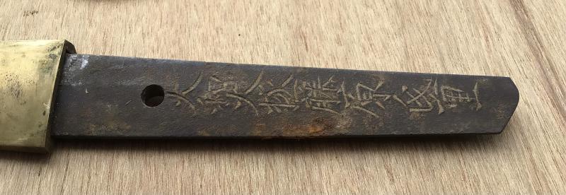 The hilt with its original samurai period civilian styled black braided wrapping over white ray skin same’ and civilian blackened brass Menuki ending a black wooden kashira pommel with no provision for a sword knot. Blackened brass civilian fushi. Voided civilian cast iron tsuba and two copper brass spacers. Plain brass habaki , ricasso. The bright blade with a very faint Hamon line and measures 560mm from tsuba to the blade tip. The tang with one securing hole. The tang signed on both sides named to the maker “Ogomatsu Fujisawa” This reputedly a famous family of sword makers dating to the 1600’s Edo period. More research is certainly needed here. The other side reads “Bright Layer Leaves August Crescent Moon”.