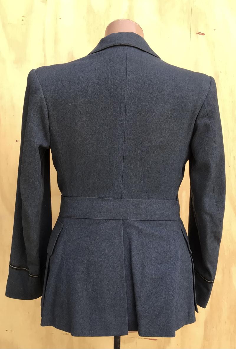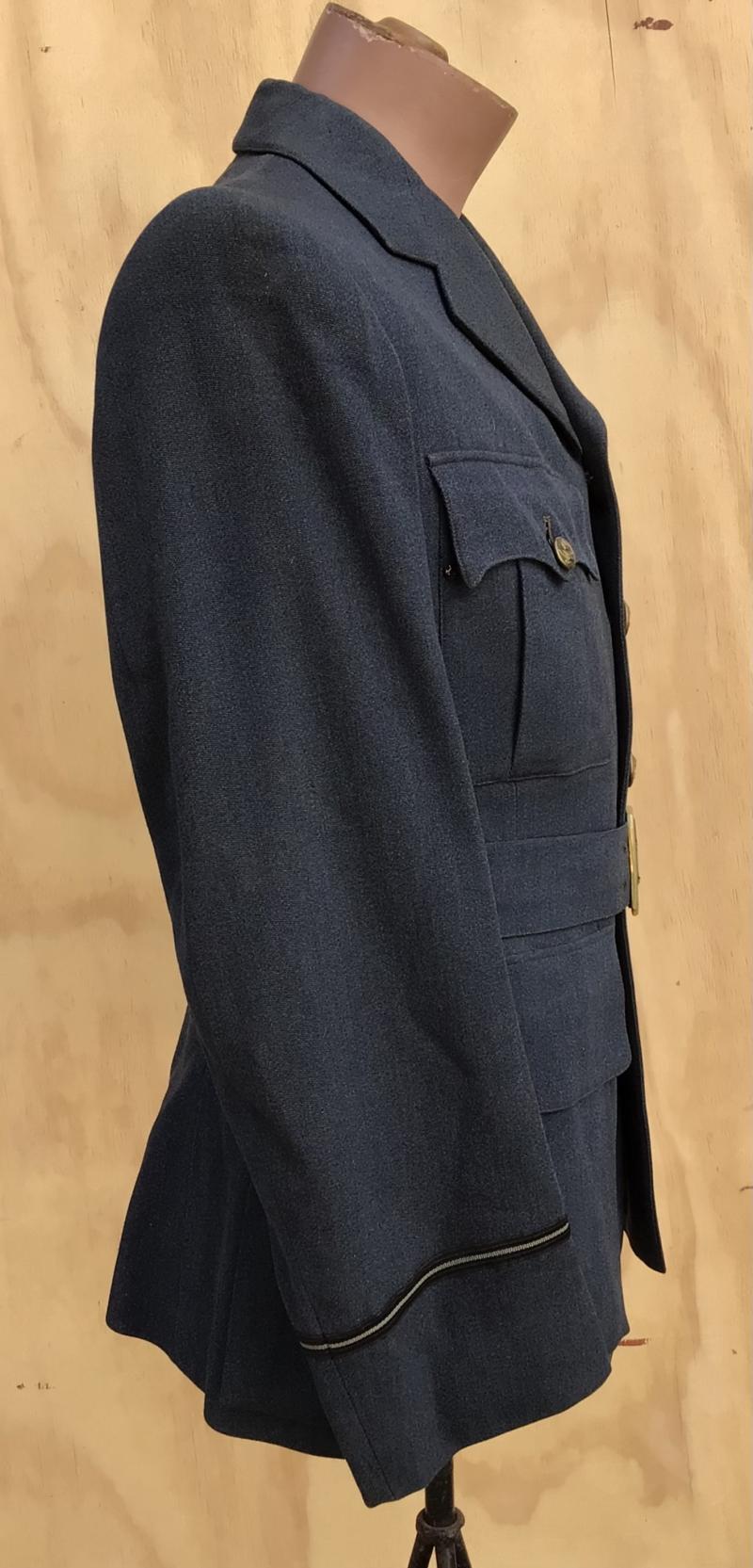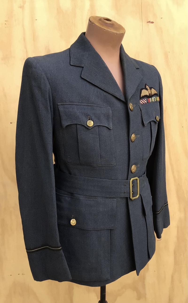 RAF light blue wool officers tailored servcie dress four pocket tunic. Has all brass Kings crown RAF buttons, padded embroidered RAF pilots wings, cuff rank for Flying Officer and place ribbon bar that includes the Distinguished Flying Cross. Comes with it fitted servcie dress belt with matching brass buckle.