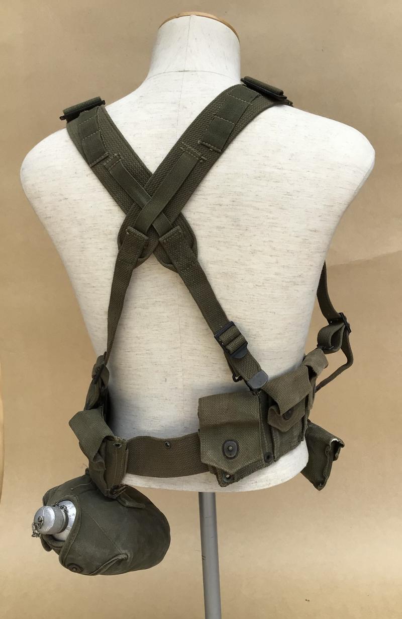 An all matching set in green web c.1944-45 consisting of M 1923 Cartridge Belt, unfortunately the last pouch on the right side has pulled the "lift the dot: press studs away from the web canvas but still displays ok. suspenders date 1944, M1942 First Aid Pouch dated 1954 compete with cardboard First aid Packet. c.1944 canteen carrier , not dated but with a late war wide web loop that secures the belt hook. M1910 water Canteen dated 1942 , Cup M1910 dated 1944.