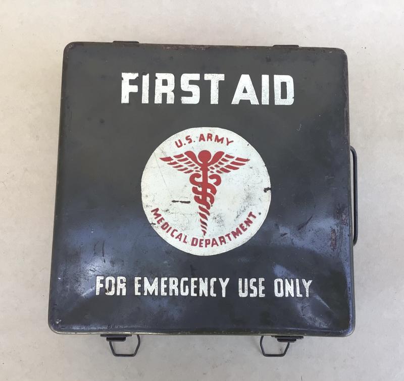 Large size. 235mm x 235mm. An excellent example with nearl all of its original OD green painted finish ad Medical Department Insignia. The inside with the original (stained) Instructions sheet. The contents are not matching with the instruction sheet and mostly consist of numerous first aid field dressings, Gauze bandages, cotton bud applicators, safety pins, torniques, Gauze sponges, scissors etc. Still makes for a very impressive display lot.