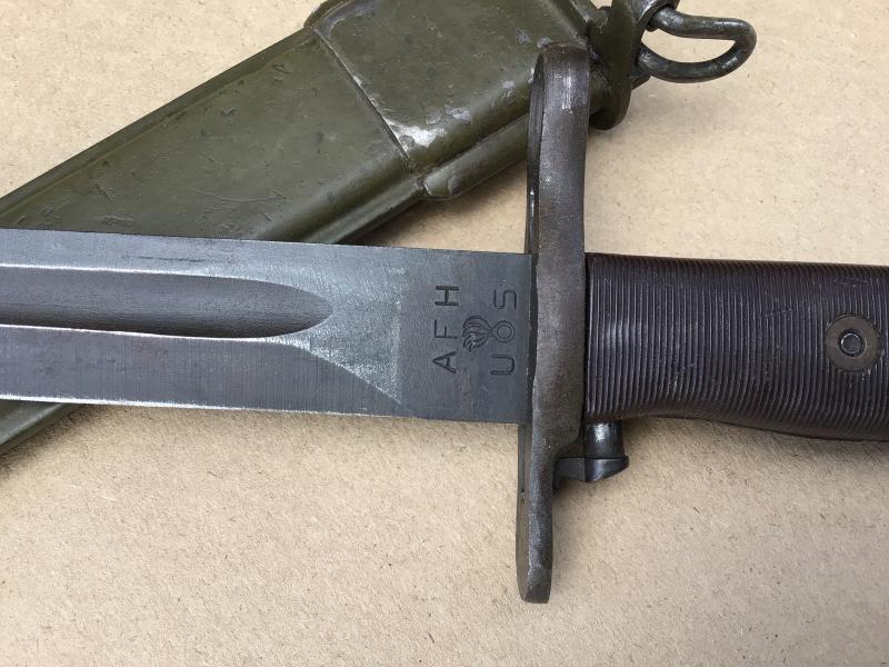 Good example with working locking stud, good Bakelite grips. The blade maker marked ”AFH”. Comes with its green painted fiber plastic scabbard. Good used example.