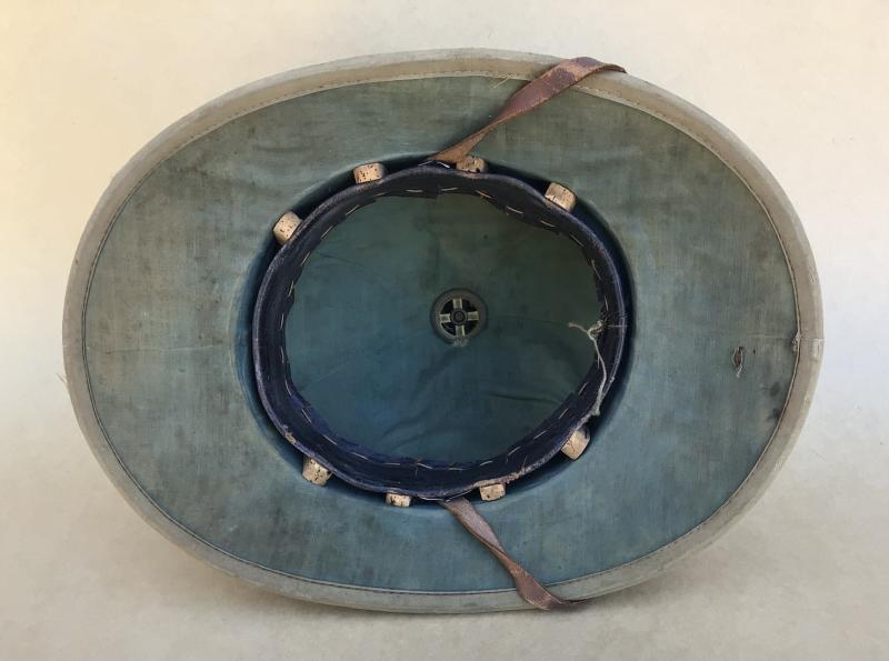 pattern pith helmet. Retains a very good shape with no damage to the cork as often is encountered on these fairly rare helmets. Khaki cotton drill material over cork with its original brown leather chin strap remaining. The inerterior linined in green cotton drill and fitted with a black leather sweatband. again the with service wear but no damage. The front of the helmet fitted wit the French colonial anchor belt badge in gilt brass.