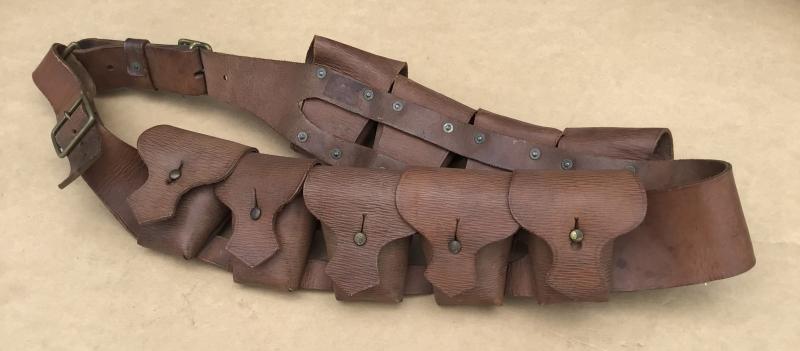 Excellent example. Brown leather 9 pouch bandolier. British made and dated 1915.