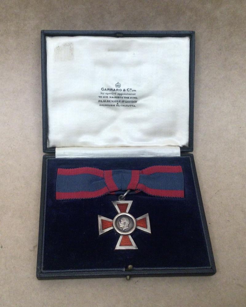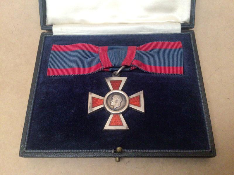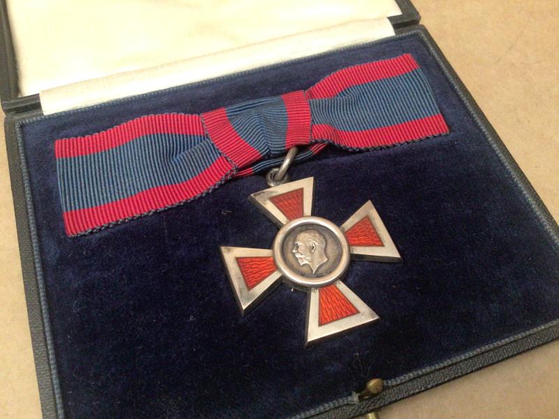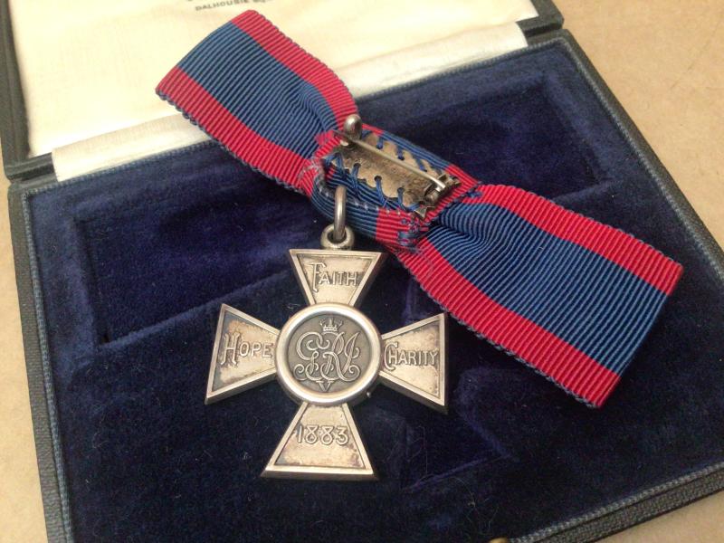 The medal is an enamelled silver Maltese cross with a central figure of the reigning monarch, in this case King George V.The reverse bears Faith,Hope and Charity and 1883(the year it was instigated) on each of the four arms.The royal cypher is in the centre.This is suspended from the red and blue silk bow ribbon fixing.In very good condition.