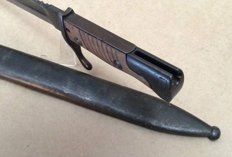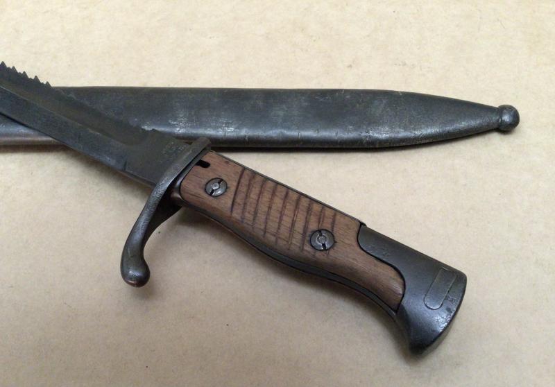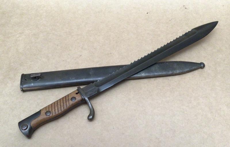 a good clean example of the so called sawbuck "Butcher Bayonet". Dark toned blade with Mauser makers mark and dated 1917 with Prussian Army acceptance stamp. Good light coloured clean wood grips. Working locking stud.
