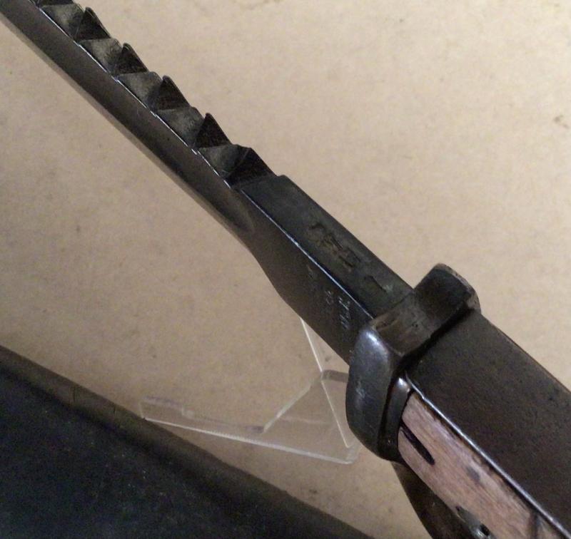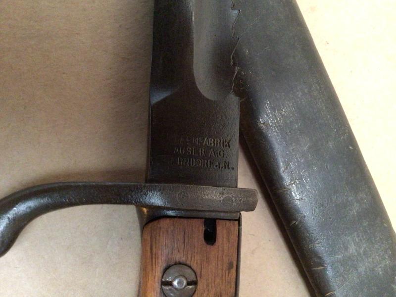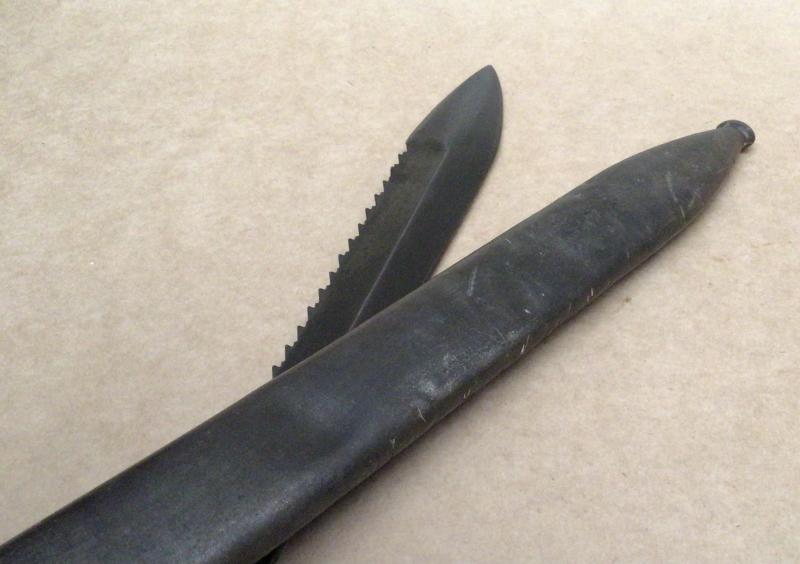 Comes with its all steel scabbard, this with a few dents and the small screw holding the mouth to the scabbard is missing. Otherwise it fits well to the bayonet.
