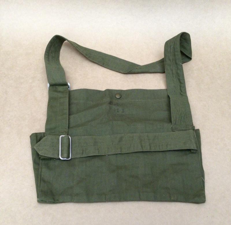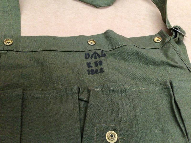 Khaki green HBT material. Five pocket grenade carrying vest. D arrow D stamped and dated 1944. Unissued condition.
