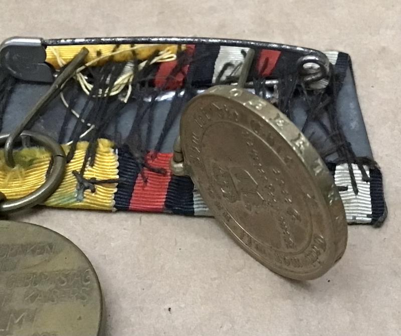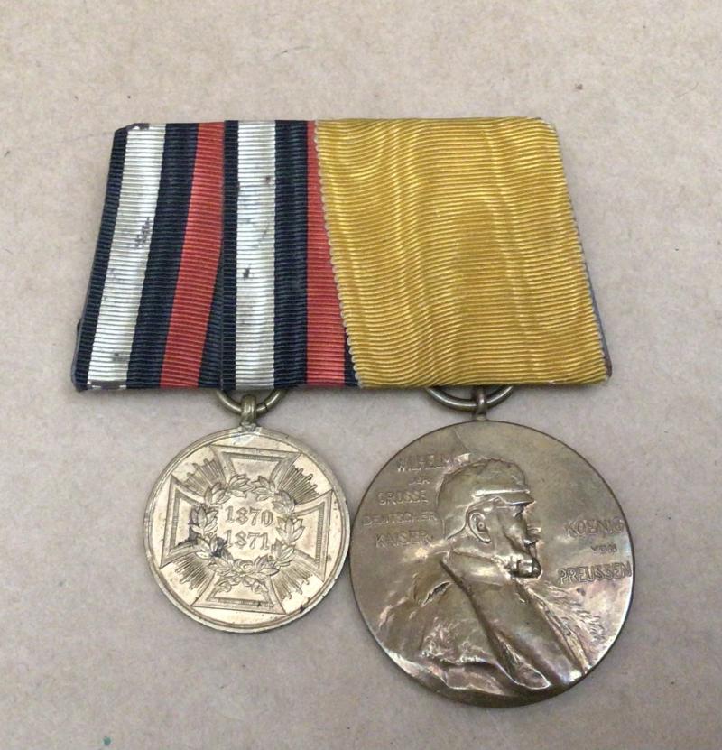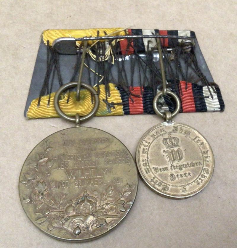 1870-71 Franco Prussian War medal for combatants. This with an impressed inscription around the rim indicating it was made from the metal from captured guns. Prussian 1897 Centenary Medal. Both mounted on a detachable full size ribbon bar.